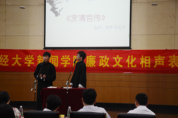 四支来自不同学院的队伍进行了激烈角逐,让在场师生感受了一场传统文化盛宴。《贪清官传》以幽默风趣的语言,通过对比贪官石崇、和珅与清官萧何、王恭的故事讽刺了当今社会官员包二奶、炫富、拼爹等不良现象;《清官传》介绍了狄仁杰、包拯以人为本、为民请命、处理案件的故事;《清官册》讲述了包拯为罢免张尧佐,屡次直谏宋仁宗的故事;单口相声《连升三级》源自著名相声表演艺术家刘宝瑞的作品,讲述了富二代张好古官运亨通的荒谬故事。