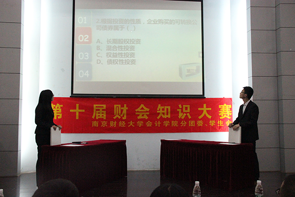 4月26日晚,由会计学院主办的我校第十届财会知识大赛总决赛在仙林校区经济学科楼报告厅顺利举办。整场比赛分风采展示、谁与争锋、英雄联盟、荣耀夺冠等四个篇章。