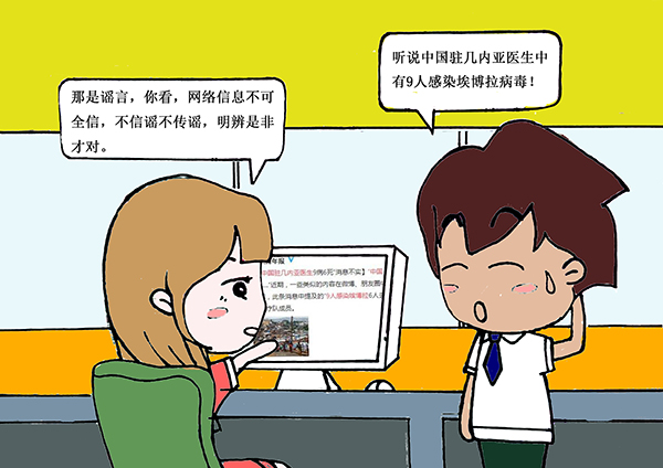 漫画共五幅,分别从“消极言论要制止、清朗网络树新风”、“不明信息慎分享、查明事实清是非”、“网络志愿在行动、青年力量创未来”、“身边活动随手拍、分享感悟文明来”、“校内活动多参与、积极活泼戒消沉”等方面号召网络文明志愿者自觉自愿地行动起来,挺身而出,主动成为网络环境清明的生力军。