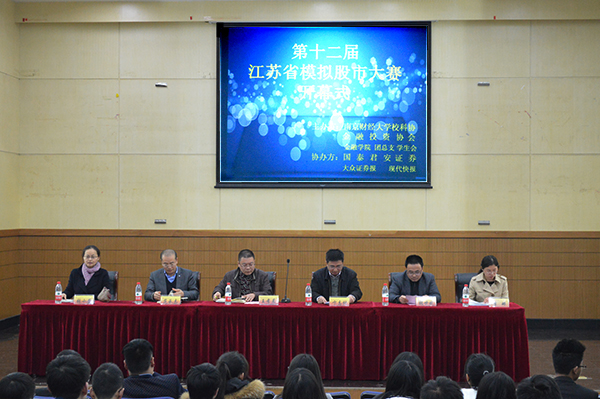 4月13日中午,“国泰君安杯”第十二届江苏省大学生模拟股市大赛开幕式在我校仙林校区管理学科楼报告厅举办。本次大赛由校团委、大学生科学技术协会金融投资协会、金融学院主办,大众证券报、现代快报协办。各相关单位负责人,我校及各兄弟学校学生代表参加了开幕式。