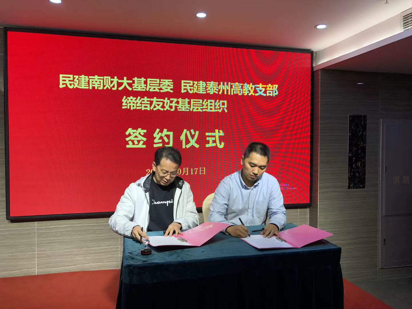 校民建主委朱龙杰、民建泰州市高教支部主委姜枫代表双方基层组织在《缔结友好基层组织协议书》上签字。