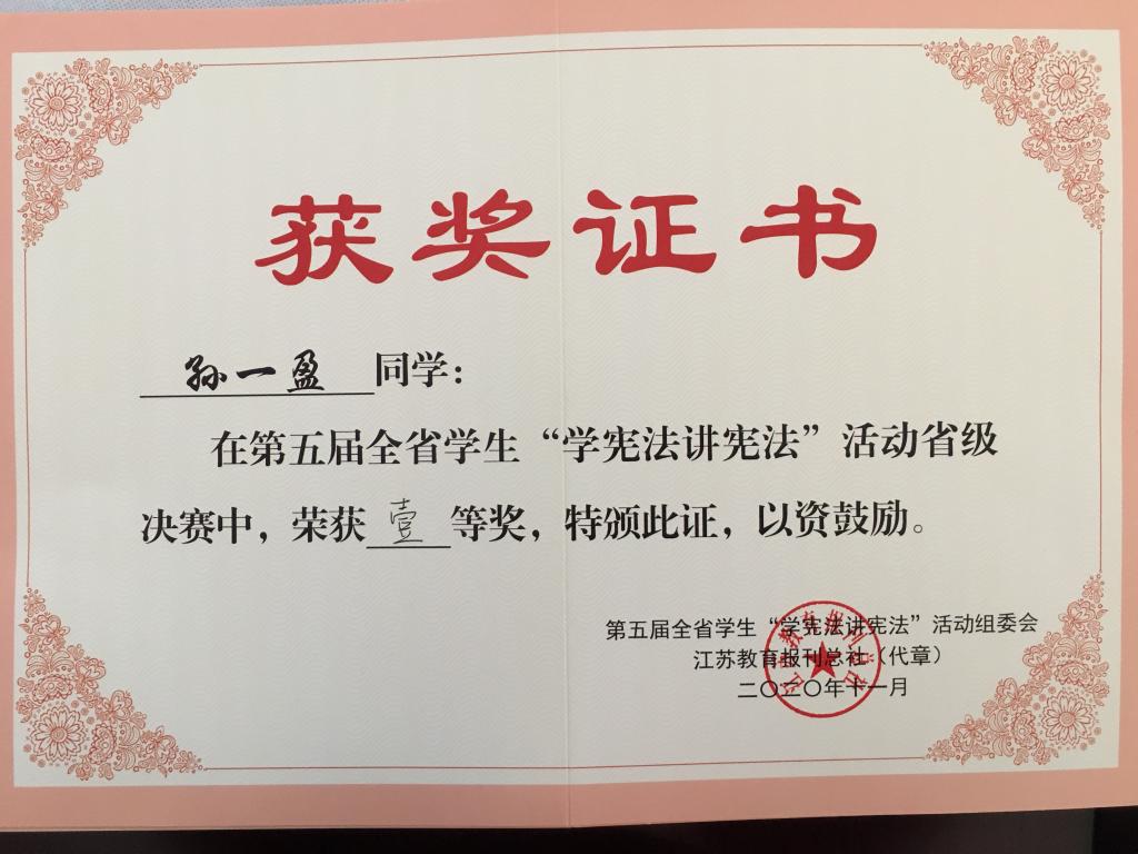 11月7日-8日,第五届全省学生“学宪法讲宪法”活动省级决赛在江苏警官学院景程大厦报告厅举办。我校法学院学生吴聪、孙一盈分别获法治知识竞赛一等奖和演讲比赛一等奖。