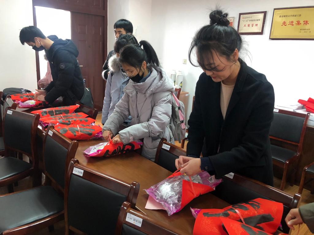 春节“福鸭”,暖心到家。工商管理学院邀请学院有书法特长的学生手写“福”字,赠送给学院的家庭经济困难学生。一张张手写的“福”字与南京特产盐水鸭组成了“福鸭”返乡礼包。学院将礼包分别送到特困生手中,将学院的节日祝福送到每一位学生家庭,与学生和家长共同分享新春佳节的喜悦。“谁说没有一只鸭子可以游过长江?南财‘福鸭’就可以!这下可以让爸爸妈妈尝一尝地道的南京特产盐水鸭啦!”家住甘肃的受资助同学拿到南财“福鸭”返乡礼包后兴奋地说道。