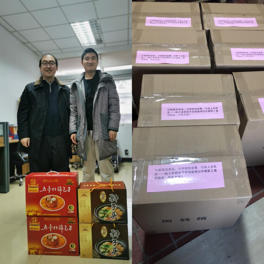 今年我校共有近60名外地单身教职工积极支持国家疫情防控工作大局,留宁留校过年,校工会给每位就地过年的单身教职工送去了春节慰问礼盒。礼盒上印有春节祝福:与祖国共命运、与学校共发展、与亲人共欢乐—-校工会祝在宁在校过年教职工春节快乐、牛年大吉!礼盒直接快递到他们手中。收到慰问礼盒的老师非常开心,他们对学校的这一暖心举措表示感谢。