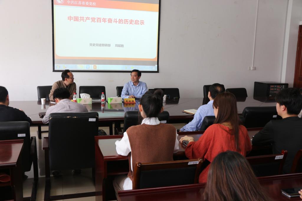 为进一步引导全体师生更加深入系统地了解党史,4月29日,省委党史学习教育宣讲团成员、省委党校党史党建教研部副主任、教授周延胜应国际经贸学院邀请,在仙林校区德经楼308会议室作题为“中国共产党百年奋斗的历史启示”的专题宣讲。宣讲会由国际经贸学院党委书记张阳军主持。学院领导班子、本科生与研究生代表参加宣讲会。