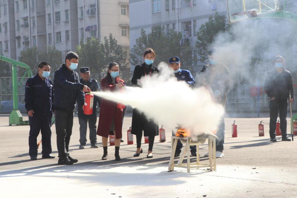 动员结束后,黑龙江路消防站队长何思成在第一会议室就火灾发生的原因、种类、预防措施、处理办法等内容进行了详细讲解与指导。随后,模拟火灾现场并进行火灾疏散演练。警报铃声一响,在物业公司疏导组人员的指挥下,所有参加演练人员有序而迅速地疏散到了楼外安全地带。最后,在福建路校区篮球场组织参加人员进行了实地消防演练,指导大家正确使用灭火器扑灭火焰。