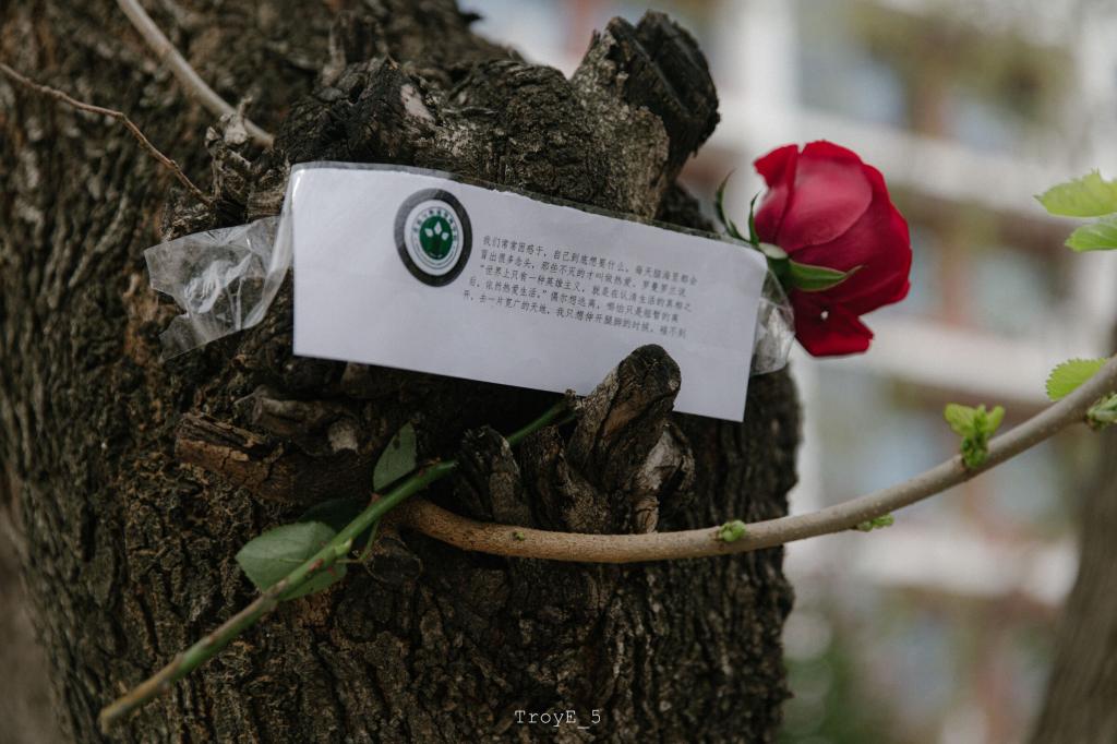 伴着和煦的春风,身穿玩偶熊服的志愿者向同学们发放带有温馨祝福语的浪漫玫瑰;同时,电梯中、树上、路灯上、指示牌上……玫瑰花、写满暖心祝福的便签条悄悄地放置在学校的各个角落,随处可见,喜欢的同学可以免费领取。