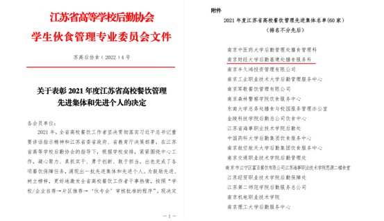 近日,江苏省高等学校后勤协会学生伙食管理专业委员会公布2021年度江苏省高校餐饮管理先进集体和先进个人评选结果,我校后勤基建处膳食服务科获评“2021年度江苏省高校餐饮管理先进集体”。