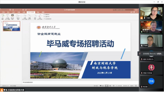 为贯彻落实省政府和我校关于毕业生就业工作的决策部署,全力促进毕业生更加充分更高质量就业,全面深化校企合作,5月13日晚,财政与税务学院联系毕马威公司线上开展了访企拓岗促就业专项行动。学院副院长方国昌、毕马威全国校园招聘负责人李延均以及学院部分本科生、研究生参加专项活动。活动由学院党委副书记李慕原主持。