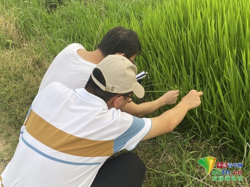 经院学子在盱眙黄花塘镇芦沟社区稻田中观察水稻