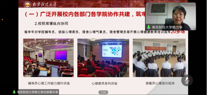 我校党委学生工作部部长、学生处处长韩力争在发言中介绍了我校心理健康教育工作的发展现状和队伍配置,重点讲解了中心教育教学、实践活动、咨询指导、预防干预为主要内容的“四位一体”育人体系以及校内、校际、家校、医校、校地协作的“五协联动”工作机制。