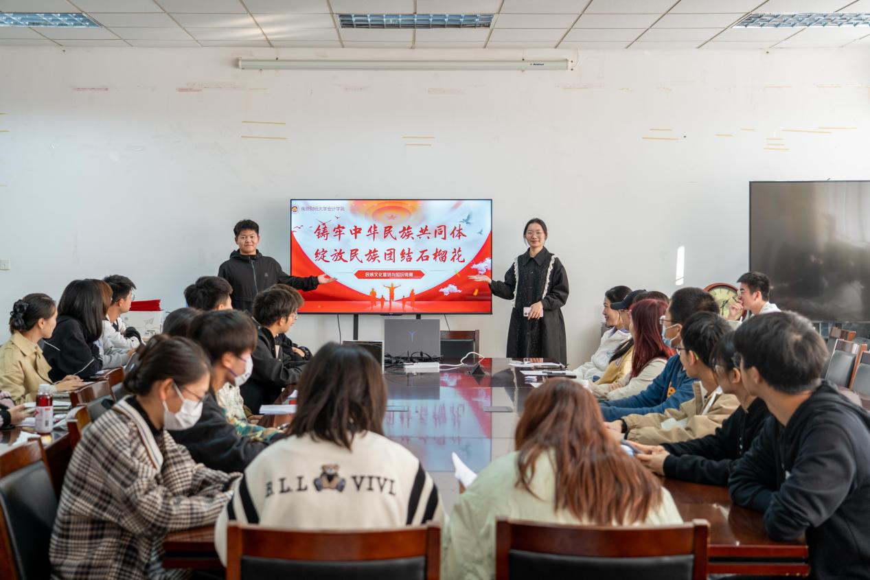 为深化宣传效果,各学院通过班会、宣传展板、网络新媒体等形式全面深入宣传党的民族政策,营造民族团结浓厚氛围,推动宣传教育走深创新。外国语学院学生自编自演历史短剧《文成公主》,为贵州从江少数民族地区儿童线上讲述团结故事,弘扬民族精神;会计学院开展主题教育宣讲暨知识竞答;营销与物流管理学院、信息工程学院开展“铸牢中华民族共同体意识”主题班会,各民族学生在分享民族传统文化、风土人情中深切体会铸牢中华民族共同体意识的重大意义;应用数学学院开展“民族团结手牵手,和谐发展心连心”宣讲活动,以互动问答、政策宣讲形式不断增强中华民族的向心力和凝聚力,推动铸牢中华民族共同体意识入脑入心。