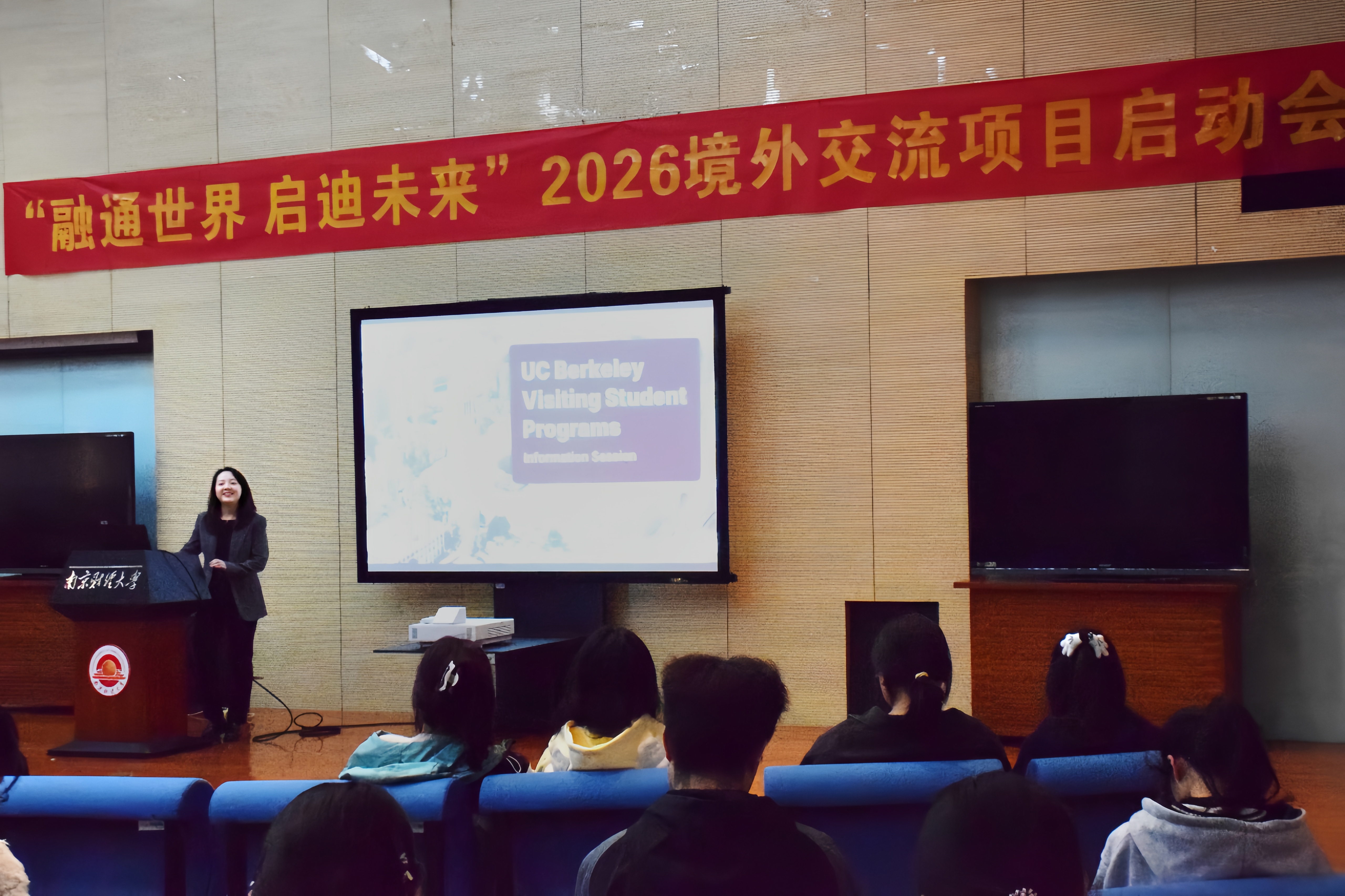 为推动高水平大学建设,助力高层次国际化人才培养,11月13日晚,我校在仙林校区图书馆世界之窗举办“融通世界 启迪未来”2026境外交流项目启动会。美国加州大学伯克利分校国际事务与伙伴关系部主任Echo Xiao,国际合作与交流处处长杨智华、国际交流科相关人员、往期项目学生代表及外事交流助理团学生代表参加启动会,美国史蒂文斯理工学院研究生招生主管Joe Huang线上参会。活动由外事交流助理团成员黎家瑜主持。