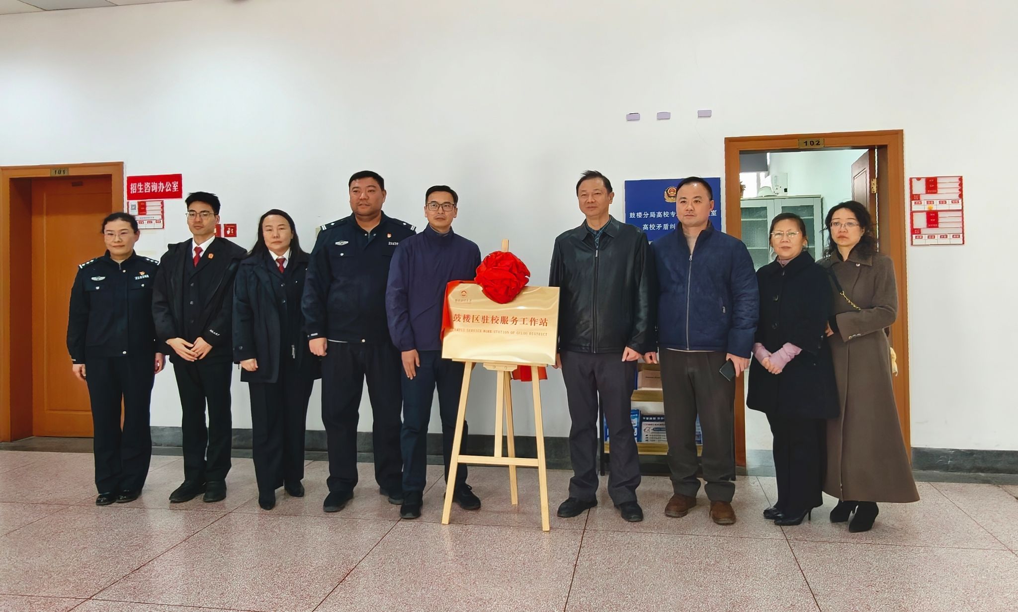 11月27日下午,鼓楼区驻校服务工作站在我校福建路校区揭牌。鼓楼区委政法委副书记韦伟,属地公安、法院、检察院以及街道等多部门相关人员,我校保卫处及福建路校区师生参加揭牌仪式。