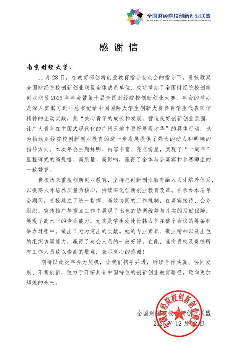 近日,全国财经院校创新创业联盟向我校发来感谢信,对我校承办全国财经院校创新创业联盟2025年年会暨第十届全国财经院校创新创业大赛给予高度肯定,并向学校及全体工作人员致以衷心感谢。