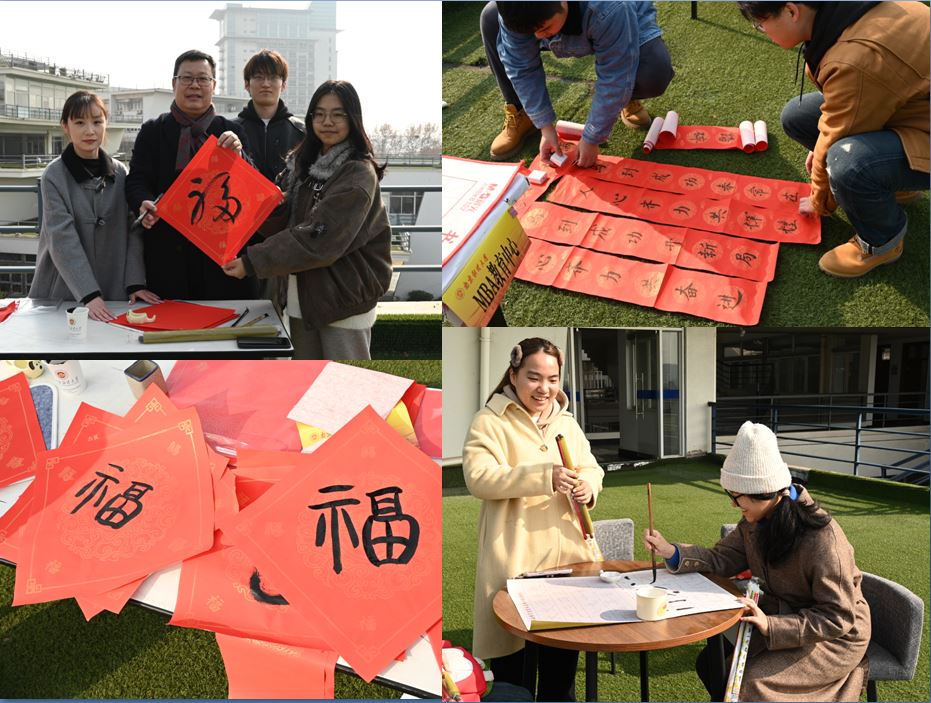 许立俊部长现场为师生题写红“福”和春联。德正楼四院一中心及金陵书画社师生共十八名代表,联袂书写二十米长卷,为“明德正心”注解。随后,现场师生纷纷加入活动,以笔墨交流,互致祝福。活动现场还设置了“新手体验区”“雨花石篆刻区”,现场师生兴致盎然,收获满满。