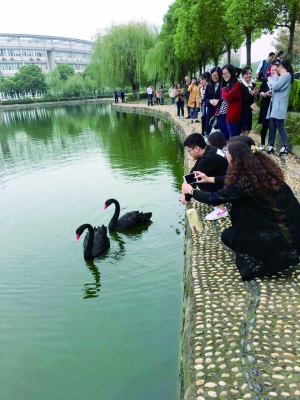 黑天鹅夫妇引来学生围观拍照 学校供图