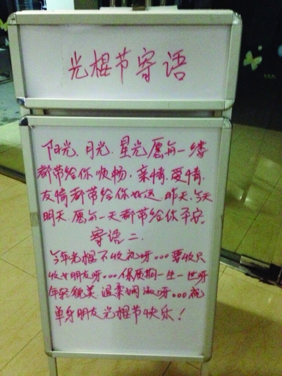 “一号站的阿姨你威武雄壮!”“阿姨真有才!”这两天,一幅“光棍节寄语”照在人人网上引来了不少网友的热传。照片中寄语的作者正是南京财经大学的一位普通宿管阿姨,然而这位普通的阿姨通过新颖的方式,为广大“光棍”送去了祝福。