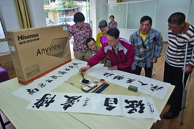 ; ; 昨日,南京锁金三村蒲公英残疾人互助社收到了国庆节的礼物,南京财经大学的教师丁丁(左一)为刚成立不久的互助社送来了一台42英寸液晶电视,而著名书法家张宁也为互助社题写了社名以及“博爱、自强”的书法作品。据了解,“南京蒲公英残疾人互助社”是在玄武区残联的帮助下于今年上半年成立的。;;;;;