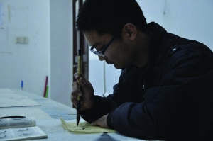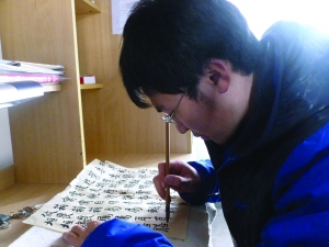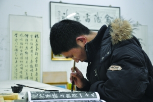 ; ; ;高正扬是南京财经大学应用数学院的学生,对于书法这个爱好,小高有部“血泪史”。;;; “最早接触书法是在幼儿园大班的时候,记得小时候刚刚写字,那时候应该不能叫书法,只能叫做毛笔字,每一笔都还很青涩,就像人一样。小的时候都爱玩,不爱写字,于是每天都是老妈在旁督促。”高正扬回忆说,“当时一周6天作业,一天上课,而我总是会以各种理由赖掉一天的作业,后来老妈也就算每个礼拜放我一天的假了。”;;; 高正扬说,“那些事儿,现在想来真是有趣又很好笑。印象最深刻的一次,老妈在旁边督促边打毛线,见我写得不好、不认真,本来就是急性子的老妈拿打毛线的针,一下子就戳在了我的膀子上,当即就出了血,我也一下子就哭了,于是这一天我就放假了。”;;;;; ; 不过现在回头看,高正扬还是很感谢妈妈当年的严厉。“后来我渐渐地长大了,也就自觉了,高中的时候虽然平时不写,但是到了寒暑假仍然会去上课,写一写。”现在进入到金陵书画社之后,高正扬在周末依然遵循着老师的建议去练习,“相信我和书法的情结将会一直延续下去,伴我一生。一部关于毛笔字的“血泪史”。;