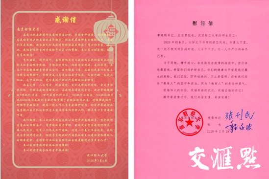 “在武汉抗击新冠肺炎疫情紧要时刻,贵校雪中送炭,倾情相助,为我校寄送大批急需的医疗物资。犹如兄弟般伸来的援助之手,使我们深受感动,也为我们打赢疫情防控阻击战增添了信心和力量。”3月4日,武汉轻工大学致信南京财经大学,感谢南财在抗击新冠肺炎疫情关键时期的倾情相助,并表示这充分体现了新时代高校的社会责任与担当。