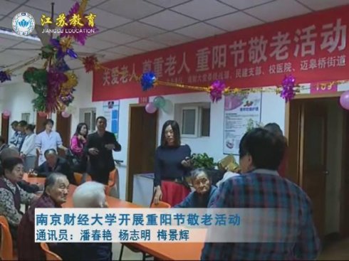 解说:10月9日上午,南京市迈皋桥金色阳光老年公寓内洋溢着欢声笑语,由南京财经大学和迈皋桥街道共同举办的关爱老人、尊重老人,重阳节敬老活动火热开展。