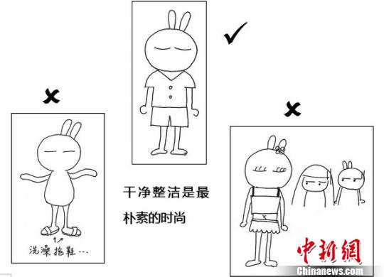 “虽然我的画技欠佳,但真的有效果”,全真真觉得这种方式比硬性的条文规定更容易为学生所接受,何不把更多的“日常规范”都画出来发给学生呢?她的想法得到学院党总支书记程利的大力支持。于是,今年暑假期间,全真真把手绘任务交给了学院学生会,由有一些绘画基础的刘京津等执笔,历时两个月,打了上百张草稿,终于在开学前赶了出来。“画了一夏天‘兔斯基’,现在见到长耳朵就想吐”,刘京津打趣地说。