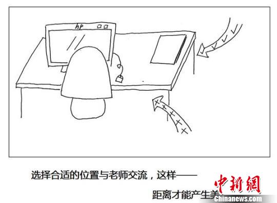 手绘《大学生日常规范》的创意是由南财大会计学院团总支全真真提出的。在平时与学生的相处中,全真真发现一些学生对于基本的礼仪规范不甚明了,如有的学生来办公室找老师,不知是因为害羞还是胆怯,总是喜欢站在老师的身后,既不礼貌,交流起来也不方便。于是,她就随手画了幅漫画告诉学生“你最好站在这里”,并发在了人人网上,希望同学们“奔走相告”。这幅简简单单的漫画在网上一公布,很快就得到了不少学生的回应,“懂了,今天貌似站错了”,“笑死我了,好有才啊”,“画中全老师的小辫真好看”……