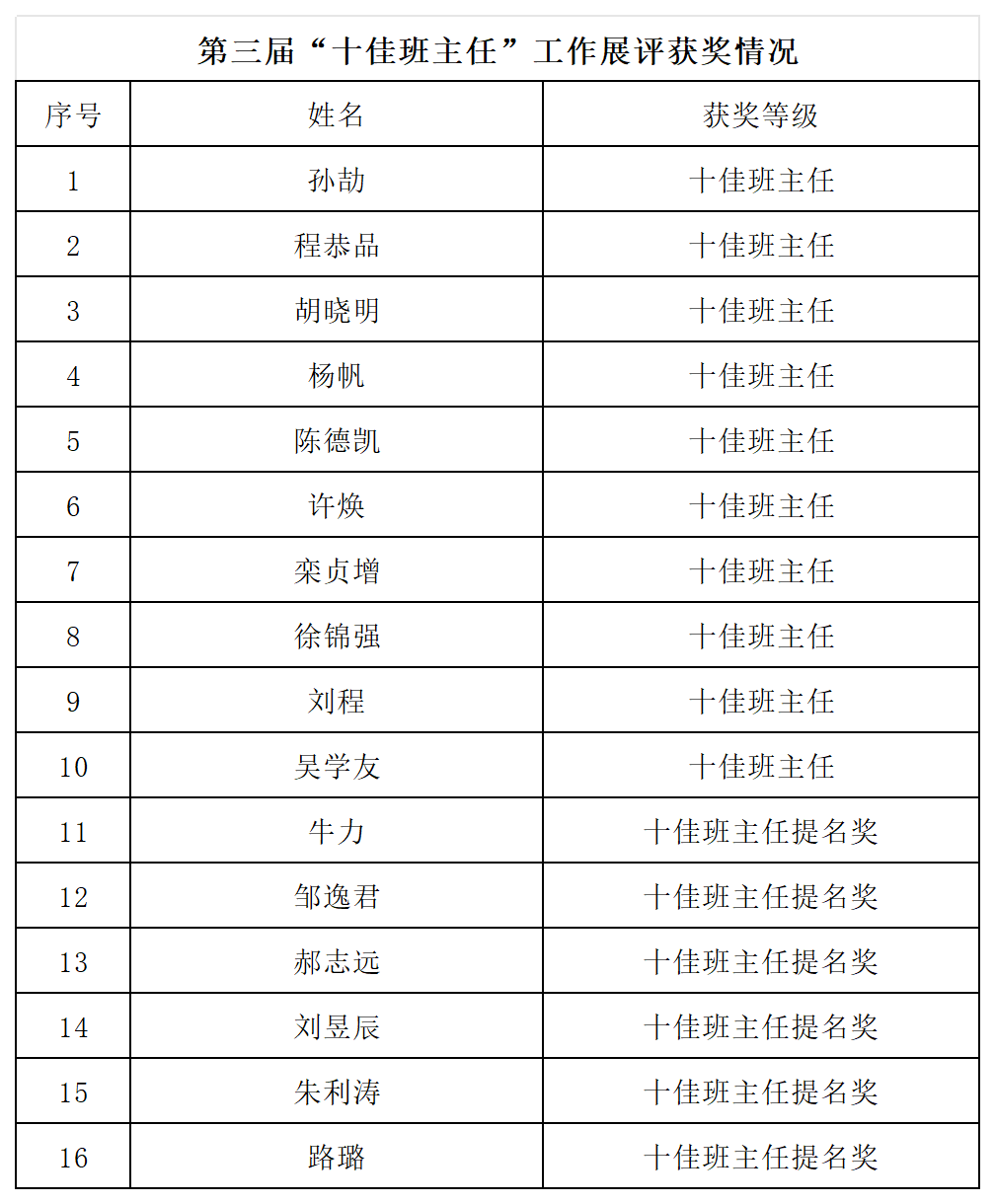 本次展评活动自10月底启动。经个人申报、学院推选、学校初评等环节,全校共有16位班主任脱颖而出,进入现场展评。展评会上,老师们围绕学生思想政治教育引领、专业理论学习与实践指导、综合素质培育与全面发展、特色班级建设与成效等方面进行汇报。他们或以“三位一体”帮扶促学业、创新班委管理模式激活力,或借竞赛实践练本领、融“思政+专业”育根基,兼顾劳动教育与心理关怀,用真挚情感、生动案例与扎实成效,生动诠释了我校班主任为党育人、为国育才的初心使命与“启智润心、育人为本”的教育追求。经评审,法学院孙劼等10位老师获评第三届“十佳班主任”。