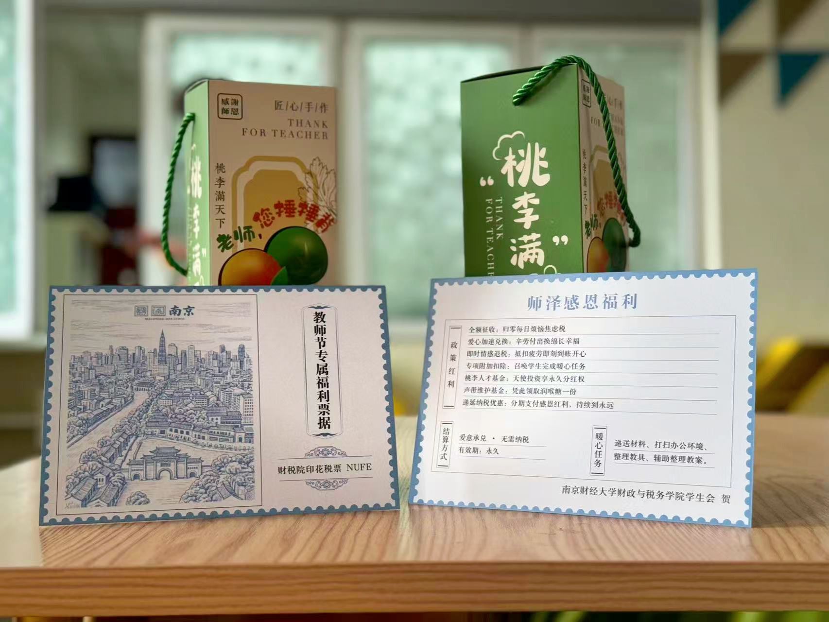 “全额征收:归零每日烦恼焦虑税;爱心加速兑换:辛劳付出换绵长幸福;即时情感退税:抵扣疲劳即刻到账开心……”财政与税务学院学子,结合专业特色,为老师们送上了别出心裁的“专属福利票据”。票据正面是精致的南京城市线描图,底部为“财税院印花税票NUFE”的标识,背面的“师泽感恩福利”,则是为老师量身定制的暖心“政策”。这份福利票据的结算方式更是暖心,“爱意承兑•无需纳税”,且“有效期:永久”,意味着这份师生情永远鲜活。