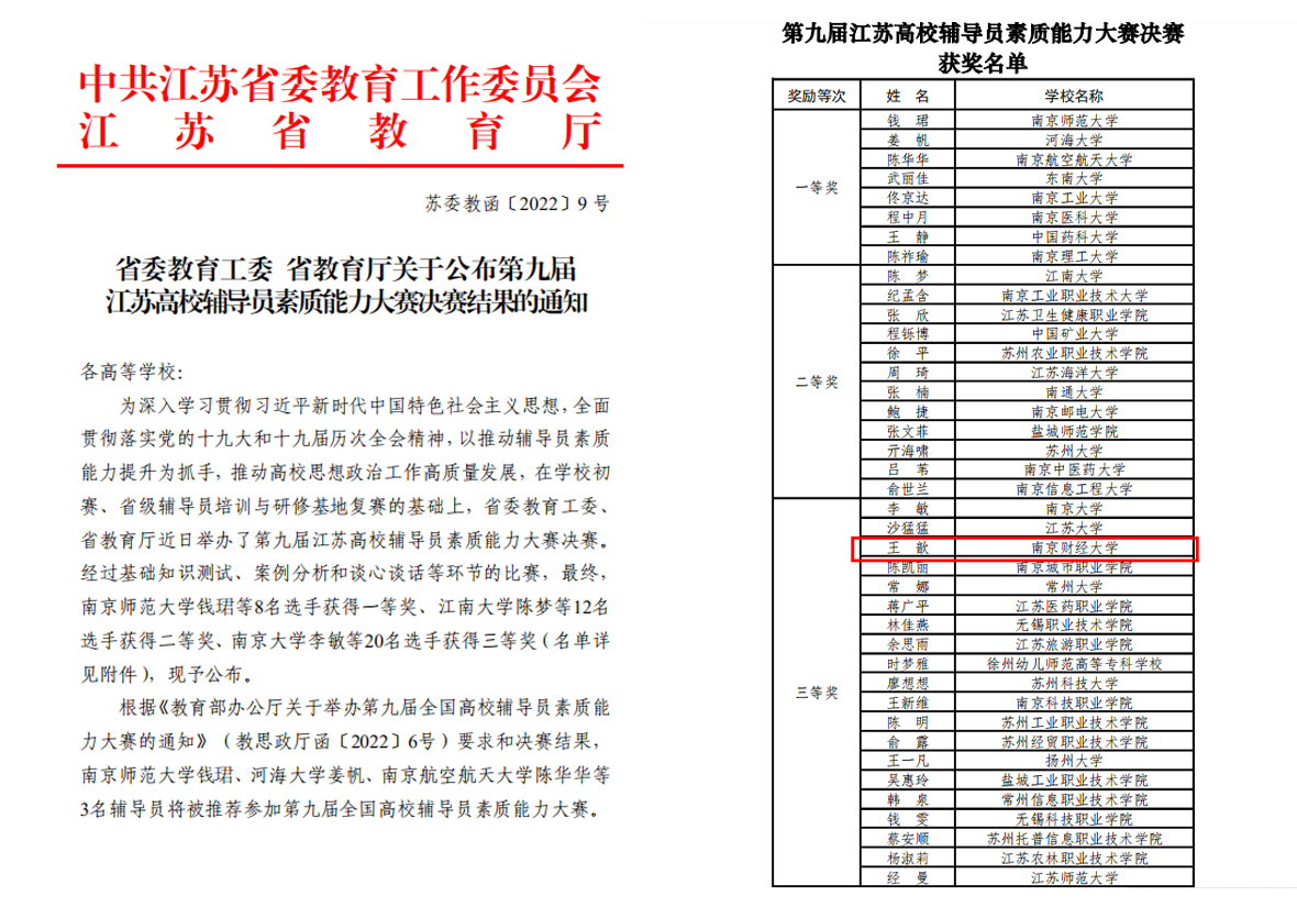 近日,省委教育工委、省教育厅下发《关于公布第九届江苏高校辅导员素质能力大赛决赛结果的通知》,我校...