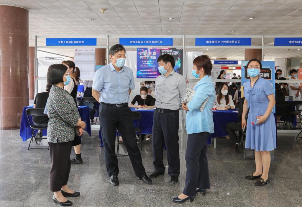 5月31日下午,我校“访企拓岗促就业”校友企业就业实习双选会、“企业进校园,同心促就业”专场招聘会在仙林校区博观楼一楼大厅举办。校党委书记张利民,校长程永波,党委副书记(正校级)温潘亚,党委常委、副校长时现,党委常委、纪委书记李茜,党委常委、总会计师黄建元,党委常委、副校长邱伟芬,党委常委、副校长李群,副校级领导朱琴华深入现场,与企业代表和学生亲切交谈。栖霞区委统战部副部长、区工商联党组书记王俊一行莅临指导。各学院负责人和毕业班辅导员现场指导学生参加双选。2022届在宁毕业生、部分非毕业班学生参加招聘会。