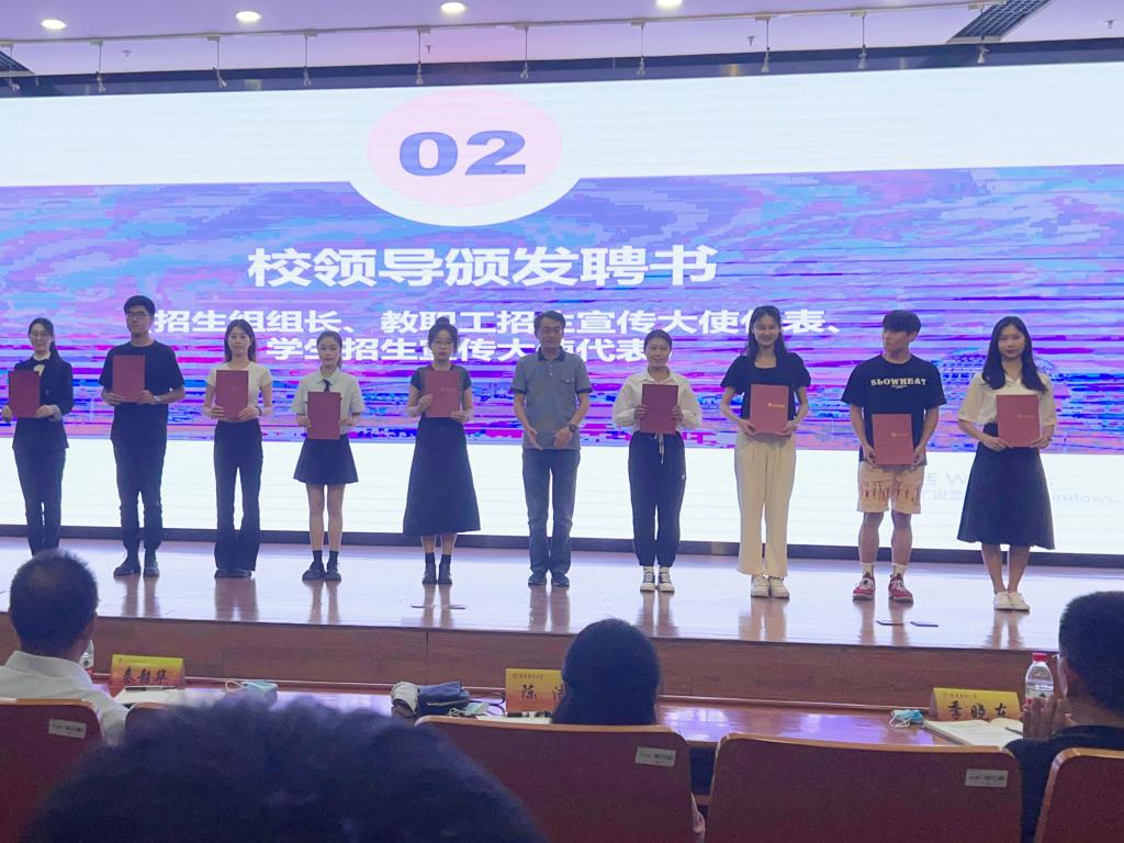 会上,李群副校长为招生组组长、教职工“招生宣传大使”代表、学生“招生宣传大使”代表颁发聘书。