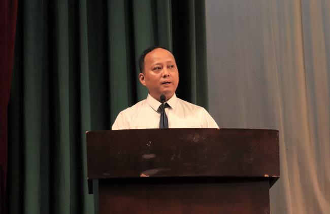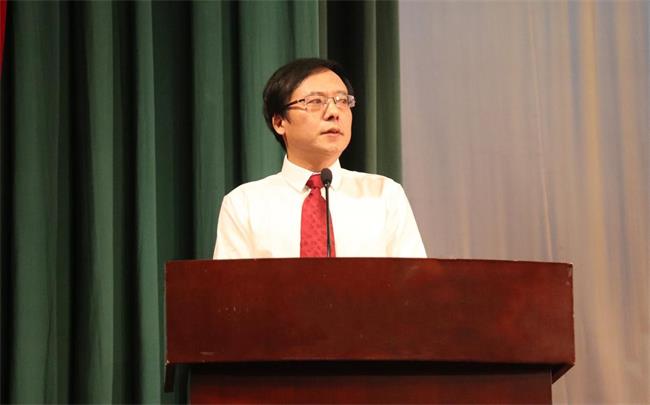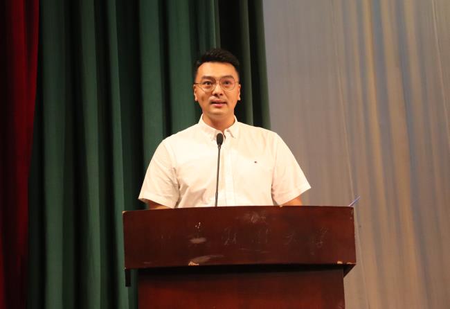 教师代表、会计系党支部书记孙海燕发言,她希望同学们做有道德、懂自律、有目标、内心强大的人,向初心前行,披荆斩棘、乘风破浪,在百年未有之大变局中书写青春力量。