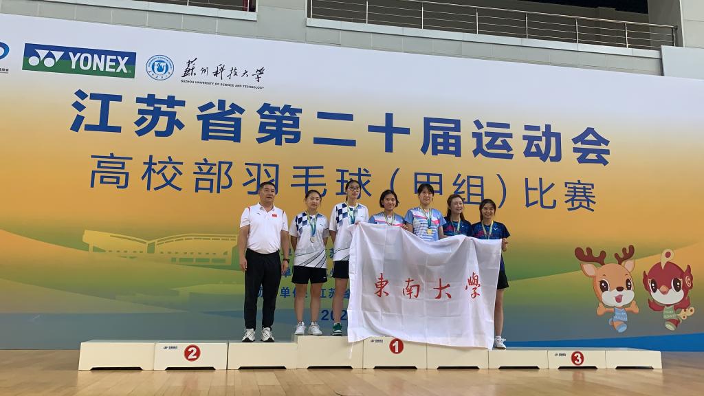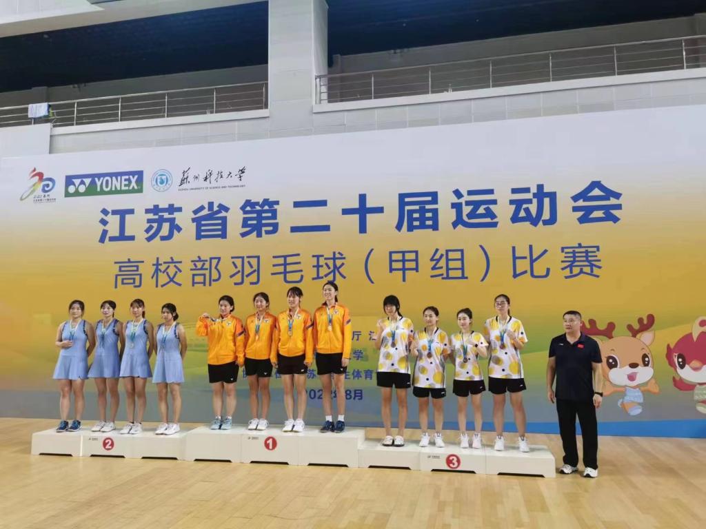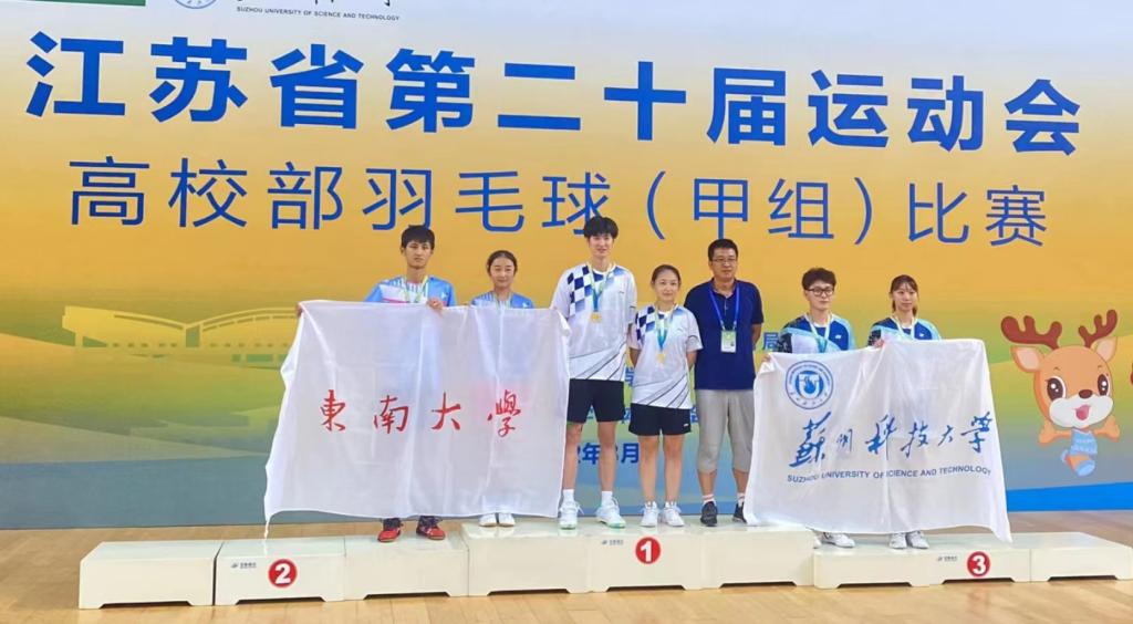 江苏省第二十届运动会高校部比赛分为本科院校高水平组(甲A)和本科院校普通组(甲B),共有男团、女团、男单、女单、男双、女双、混双七个竞赛项目,我校羽毛球项目代表队参加甲A组比赛,在体育部主任何强为领队、潘杰年老师为主教练的带领下,队员傅泓翔、张容瑞、杜仲夏、魏楷培夺得男团冠军,傅泓翔和张容瑞夺得男双冠军,傅泓翔、贾子硕夺得混双冠军,贾子硕、张宇洁夺得女双亚军,贾子硕、谭玏瑄、廖梓含、张宇洁夺得女团季军。