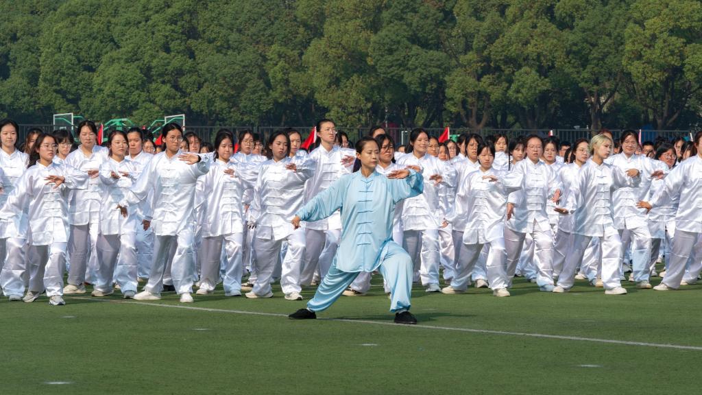 铿锵有力的节奏声响起,广播操比赛拉开了表演环节的序幕。由各学院学生组成的表演方队动作整齐划一,充满青春活力,将南财学子积极向上、团结奋进的青春风采表现得淋漓尽致。在悠扬的音乐中,团体太极拳表演以缓慢而流畅的动作展现出太极的美妙之处,身着白色太极服的南财学子身体协调,和谐呼应着音乐的旋律。最后,太极拳方阵聚成方形白底,由数名同学撑起的巨大红旗覆盖在方阵之上,如同烈焰般,在风中猎猎作响,展示着爱国情怀和团结精神。