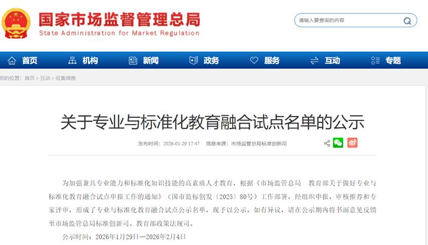 作为此次入选的试点单位,我校将以此次入选为契机,严格按照国家市场监督管理总局、教育部的工作部署和试点建设要求,聚焦专业与标准化教育融合的核心任务,系统推进产教融合育人体系建设,着力培养具备扎实专业素养和较强标准化意识、能够适应行业发展需求的高素质复合型人才,进一步提升服务国家标准化战略、支撑区域经济社会高质量发展的能力和水平,为助力产业转型升级、培育经济发展新动能贡献智慧与力量。
