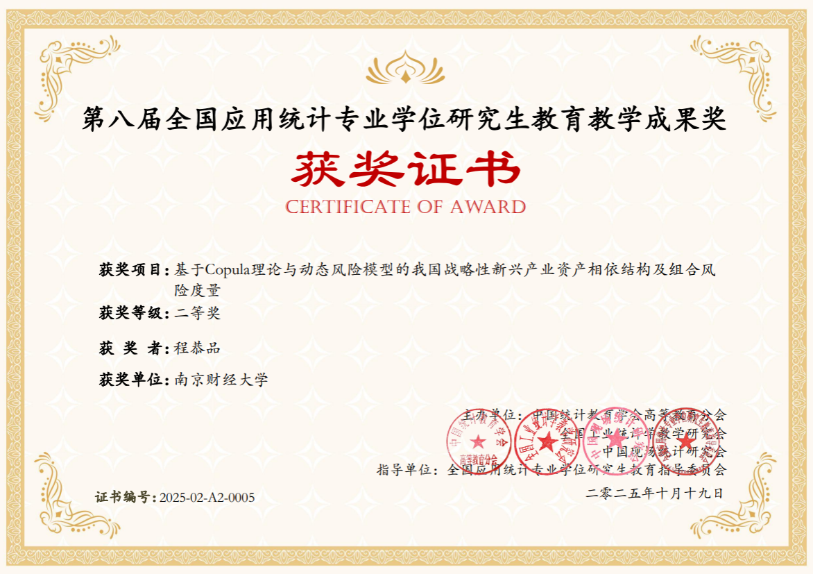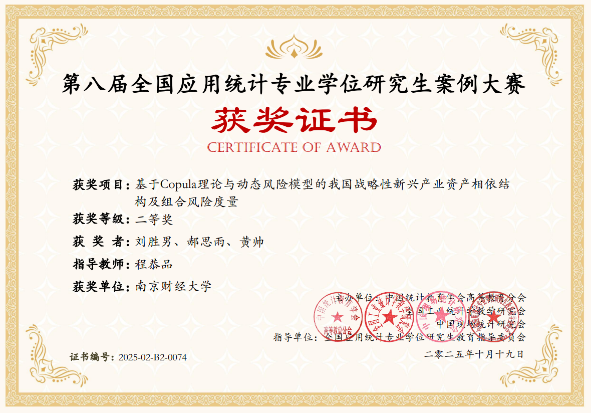 1.项目:《基于Copula理论与动态风险模型的我国战略性新兴产业资产相依结构及组合风险度量》 获奖者:刘胜男、郝思雨、黄帅;指导教师:程恭品