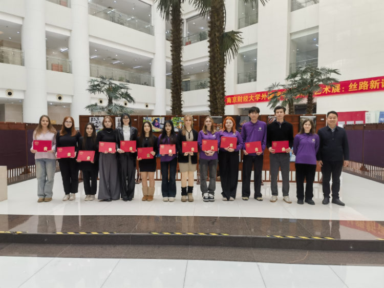 南京财经大学党委常委、副校长方勇为12位创作者代表颁发了优秀作品荣誉证书,以表彰他们在文化交流中作出的积极贡献。他表示,此次展览不仅是艺术的展示,更是同学们成长故事的温暖呈现。希望同学们在汲取知识的同时,始终保持对中国历史文化的热爱;以艺术为桥,讲述动人的中国故事,未来成长为兼具专业素养与人文情怀的跨文化使者。
